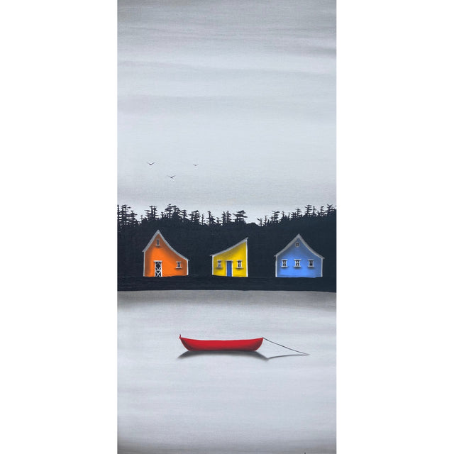 Natasha Miller is a self-taught artist who was born and raised on Vancouver Island and travelled by boat to the East coast where she currently lives with her artist husband on a tiny lobster fishing island in the Bay of Fundy. Natasha has invented her own painting technique where she creates seascapes and landscapes using homemade maple charcoal from her Italian wood fired pizza oven, soot, ash and acrylic paint used for the bold silhouettes and pops of colours. Most paintings consist of 60-100 layers of medium and sealers and take almost a month to complete. She has always drawn inspiration from quiet moments and the silhouettes all around- especially trees and rugged coastlines, the sea and its boats, birds and beaches and her current work reflects this.