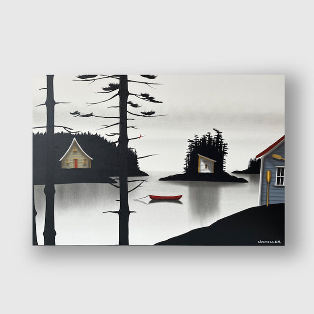 Natasha Miller is a self-taught artist who was born and raised on Vancouver Island and travelled by boat to the East coast where she currently lives with her artist husband on a tiny lobster fishing island in the Bay of Fundy. Natasha has invented her own painting technique where she creates seascapes and landscapes using homemade maple charcoal from her Italian wood fired pizza oven, soot, ash and acrylic paint used for the bold silhouettes and pops of colours. Most paintings consist of 60-100 layers of medium and sealers and take almost a month to complete. She has always drawn inspiration from quiet moments and the silhouettes all around- especially trees and rugged coastlines, the sea and its boats, birds and beaches and her current work reflects this.