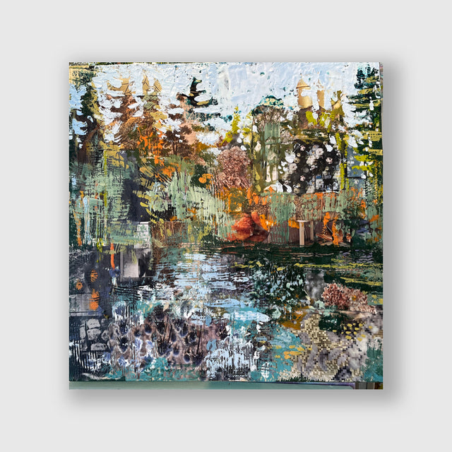 Locations near water have always attracted Ian. His lakefront home and Studio on Soyers lake, in the Haliburton Highlands, provides an abundance of inspiration. The ocean, and coastline views also feature prominently in his paintings, and recall his years living in Australia, where he eventually became a citizen. His art frequently abstracts these various shoreline views. In the current body of work Ian seeks to represent the landscape by employing a variety of techniques and surfaces (canvas, birch panels and Claybord). The use of line, in various forms, is an integral part of the work. Squiggles, straight line, dragged paint are all employed to represent the landscape which he loves so much.
