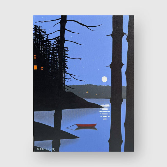 Natasha Miller is a self-taught artist who was born and raised on Vancouver Island and travelled by boat to the East coast where she currently lives with her artist husband on a tiny lobster fishing island in the Bay of Fundy. Natasha has invented her own painting technique where she creates seascapes and landscapes using homemade maple charcoal from her Italian wood fired pizza oven, soot, ash and acrylic paint used for the bold silhouettes and pops of colours. Most paintings consist of 60-100 layers of medium and sealers and take almost a month to complete. She has always drawn inspiration from quiet moments and the silhouettes all around- especially trees and rugged coastlines, the sea and its boats, birds and beaches and her current work reflects this.