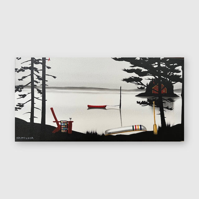 Natasha Miller is a self-taught artist who was born and raised on Vancouver Island and travelled by boat to the East coast where she currently lives with her artist husband on a tiny lobster fishing island in the Bay of Fundy. Natasha has invented her own painting technique where she creates seascapes and landscapes using homemade maple charcoal from her Italian wood fired pizza oven, soot, ash and acrylic paint used for the bold silhouettes and pops of colours. Most paintings consist of 60-100 layers of medium and sealers and take almost a month to complete. She has always drawn inspiration from quiet moments and the silhouettes all around- especially trees and rugged coastlines, the sea and its boats, birds and beaches and her current work reflects this.