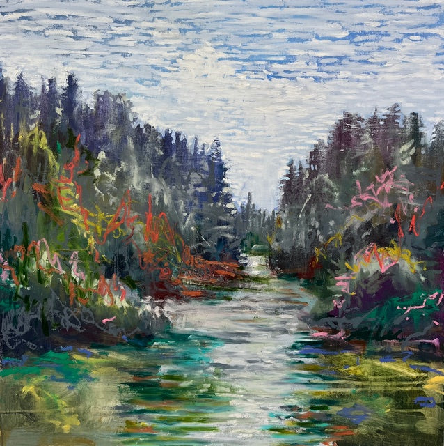 Locations near water have always attracted Ian. His lakefront home and Studio on Soyers lake, in the Haliburton Highlands, provides an abundance of inspiration. The ocean, and coastline views also feature prominently in his paintings, and recall his years living in Australia, where he eventually became a citizen. His art frequently abstracts these various shoreline views. In the current body of work Ian seeks to represent the landscape by employing a variety of techniques and surfaces (canvas, birch panels and Claybord). The use of line, in various forms, is an integral part of the work. Squiggles, straight line, dragged paint are all employed to represent the landscape which he loves so much.