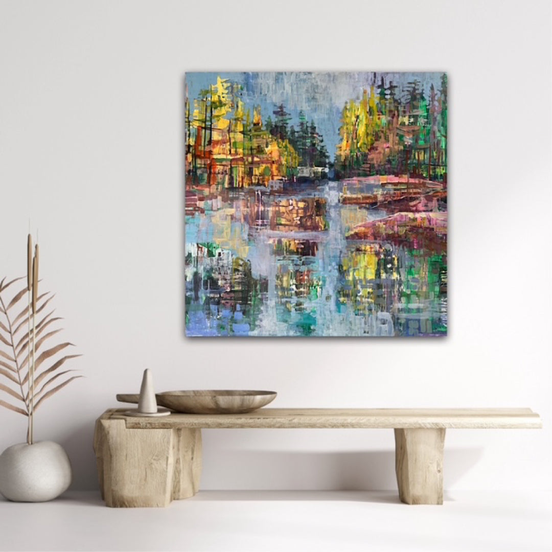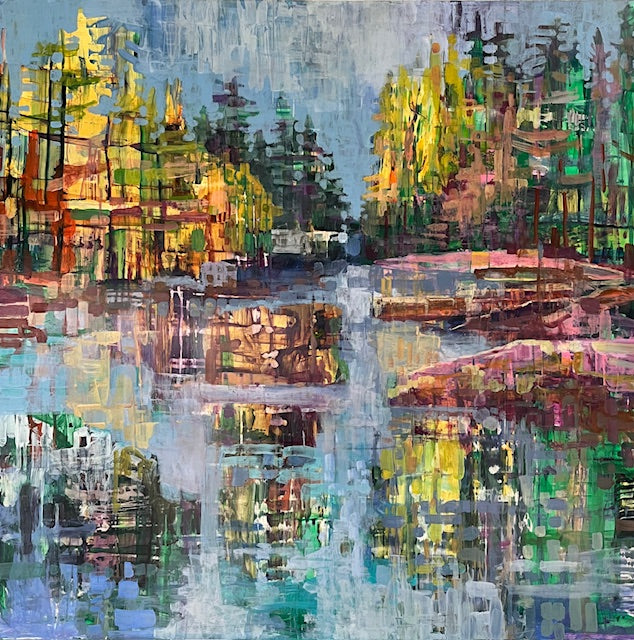 Locations near water have always attracted Ian. His lakefront home and Studio on Soyers lake, in the Haliburton Highlands, provides an abundance of inspiration. The ocean, and coastline views also feature prominently in his paintings, and recall his years living in Australia, where he eventually became a citizen. His art frequently abstracts these various shoreline views. In the current body of work Ian seeks to represent the landscape by employing a variety of techniques and surfaces (canvas, birch panels and Claybord). The use of line, in various forms, is an integral part of the work. Squiggles, straight line, dragged paint are all employed to represent the landscape which he loves so much.