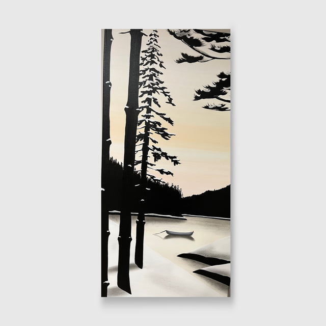 Natasha Miller is a self-taught artist who was born and raised on Vancouver Island and travelled by boat to the East coast where she currently lives with her artist husband on a tiny lobster fishing island in the Bay of Fundy. Natasha has invented her own painting technique where she creates seascapes and landscapes using homemade maple charcoal from her Italian wood fired pizza oven, soot, ash and acrylic paint used for the bold silhouettes and pops of colours. Most paintings consist of 60-100 layers of medium and sealers and take almost a month to complete. She has always drawn inspiration from quiet moments and the silhouettes all around- especially trees and rugged coastlines, the sea and its boats, birds and beaches and her current work reflects this.