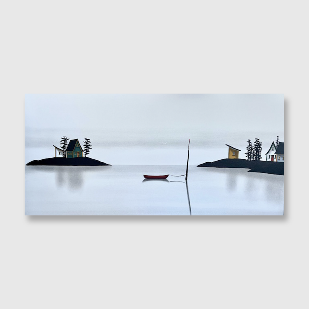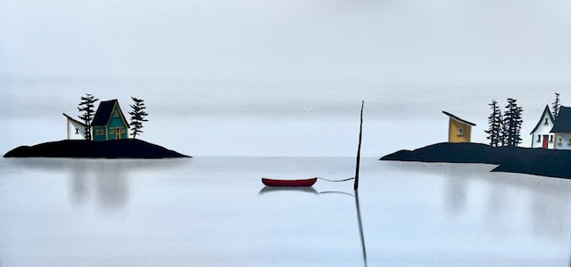 Natasha Miller is a self-taught artist who was born and raised on Vancouver Island and travelled by boat to the East coast where she currently lives with her artist husband on a tiny lobster fishing island in the Bay of Fundy. Natasha has invented her own painting technique where she creates seascapes and landscapes using homemade maple charcoal from her Italian wood fired pizza oven, soot, ash and acrylic paint used for the bold silhouettes and pops of colours. Most paintings consist of 60-100 layers of medium and sealers and take almost a month to complete. She has always drawn inspiration from quiet moments and the silhouettes all around- especially trees and rugged coastlines, the sea and its boats, birds and beaches and her current work reflects this.